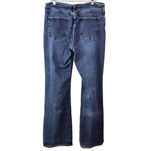 Vintage flare leg blue denim jeans from Gasoline. These have a modified, thin waistband that is different from your classic style jeans.