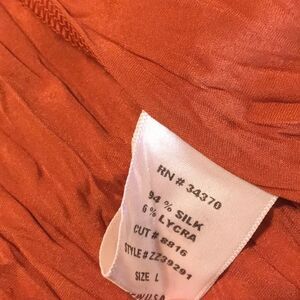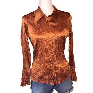 **GREAT CONDITION** **LIKE NEW** Elegant rich burnt orange colored bell ruffled sleeve button down top embellished with beautiful crystals. Accordion pleated silky stretchy fabric.