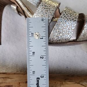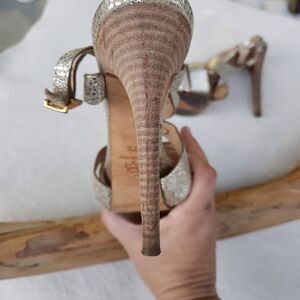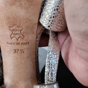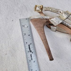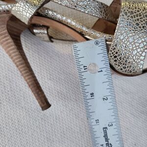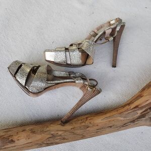 criss cross straps, natural heels, platform style, peep toe. burnished cracked gold finish. made in italy. leather