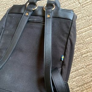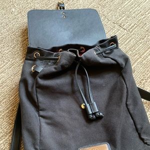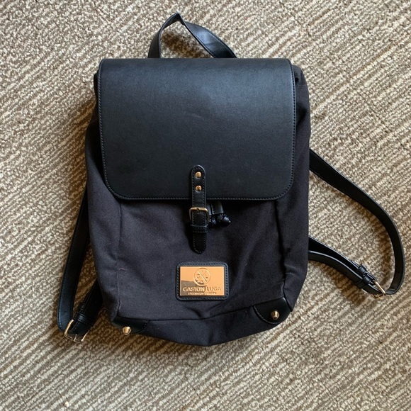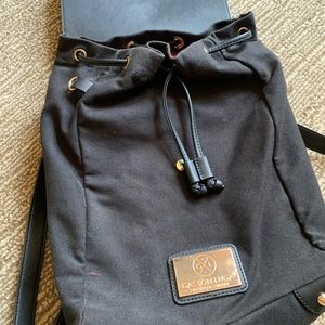 Gaston Luga - Swedish brand, black drawstring backpack with gold hardware and laptop sleeve.
