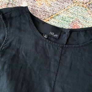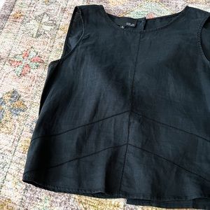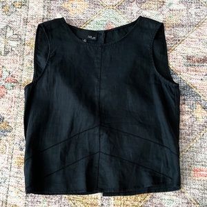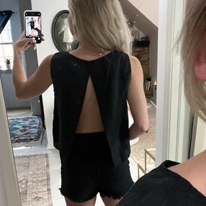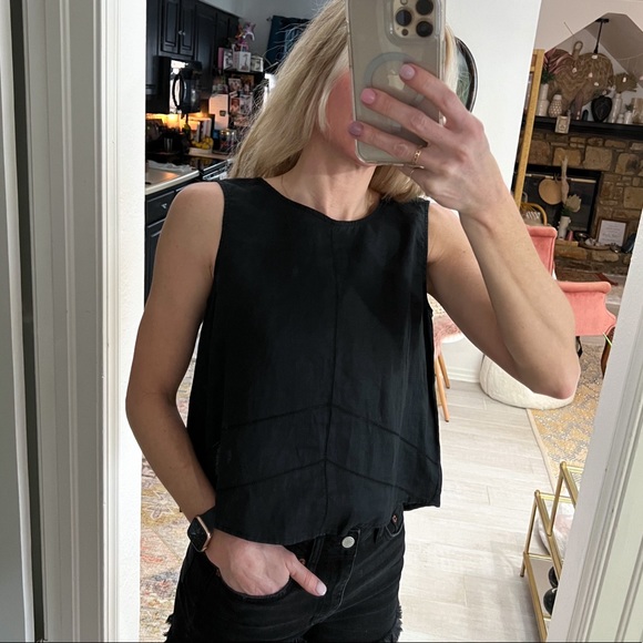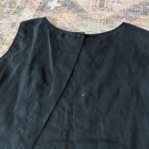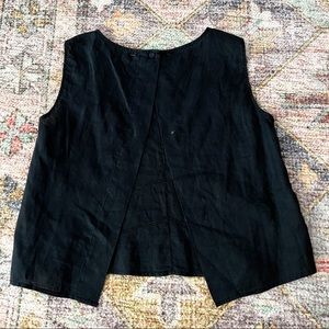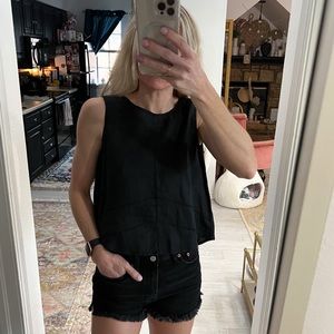 Black linen like tank. Open back with snap detail around mid back. Top has a button to close, missing one button. This has stitch detail around. Super cute on.
