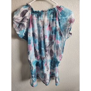 Gate Woman Sz M Watercolor Print Semi Sheer Blouse Short Sleeve Pastel