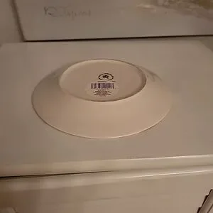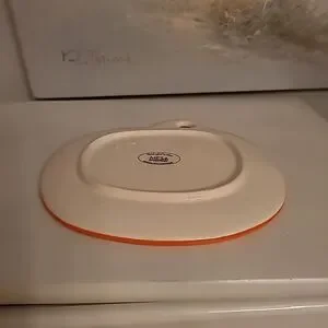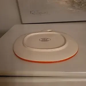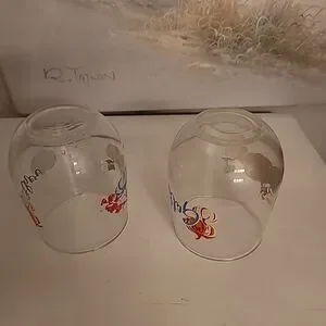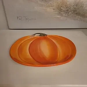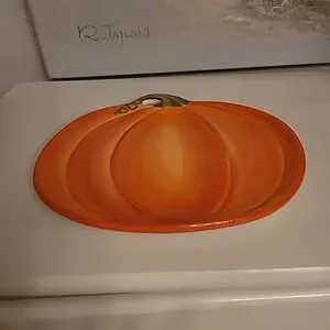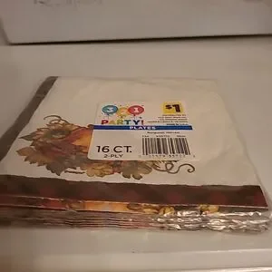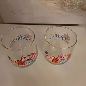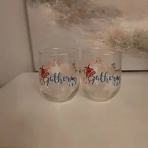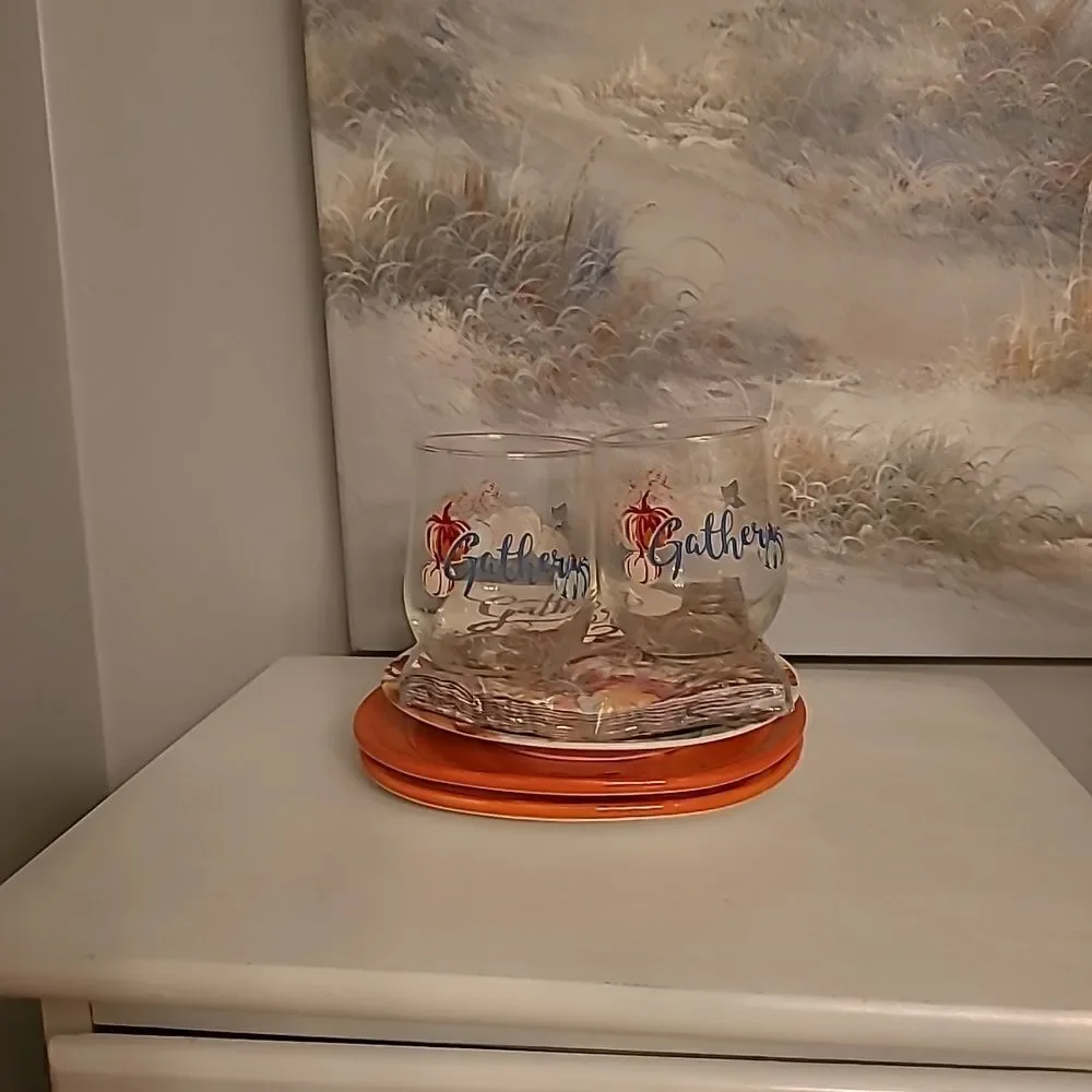 Pre-owned in good used condition. Two stem less wine glasses and one small plate that has Gather on it. The sale also includes 16 paper napkins with Gather on it and two Mesa pumpkin plates.