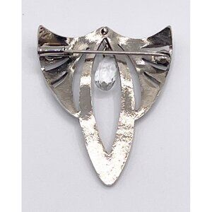 Step into the glamour of the Jazz Age with this stunning Gatsby-style rhinestone brooch. Crafted in a bold Art Deco-inspired fan shape, this silvertone pin features elegant openwork, sparkling clear rhinestones, and a faceted teardrop dangle for a touch of vintage sophistication.