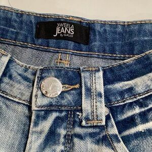 Trendy light blue jean shorts with a distressed look. Ideal for casual wear.