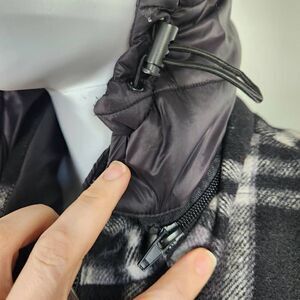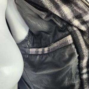 Gaudi brand puffer coat jacket with wool black and gray plaid panels. Removable, adjustable, puffer hood. Full zipper front with zipper pockets. Plaid is wool, puffer material is polyester.