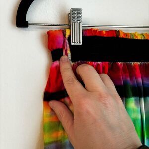 Amazing bright colorful colors thought it with pink liner underneath. Buttons make waist adjustable.