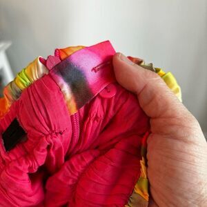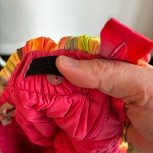 Amazing bright colorful colors thought it with pink liner underneath. Buttons make waist adjustable.