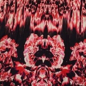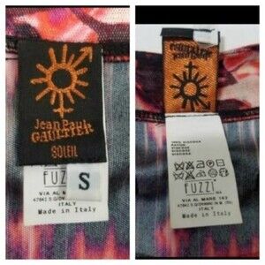Soliel Fuzzi JPG Gaultier sexy beach sundress in the roses & fire pattern print. Fuzzi viscose rayon signature fabric dress. Sleeveless flowy style with side vents on bottom hem. Folds down to nothing & doesn't wrinkle so it's perfect to pack for vacation to wear from day to night, even works as a swim coverup. Comes with matching printed tie belt. Above the knee length, loose fit. Black, red & pink swirls of dramatic flames has some sexy goth vibes. In excellent condition from my smoke free home with no flaws or damages.