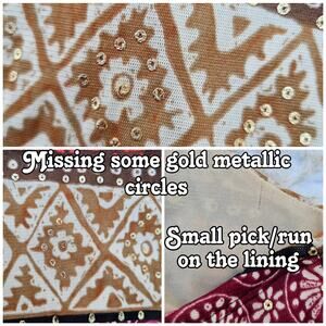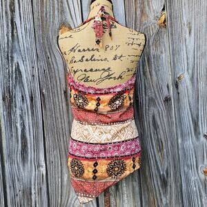 Slightly sheer gauzy fabric in a mandala geometric diamond tile stripe floral print. Earthy shades of red, brown, orange w/ gold tone metallic paint accents. Green ribbon trim under bust w/ dangle beads. V-neckline, halter top neckline w/ adjustable tie, asymmetrical handkerchief hemline, fully lined. Issues noted in photos. Very good preowned condition, overall. Size M halter tank top by dress barn.