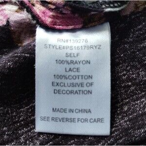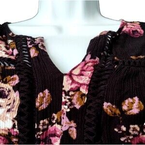 Gauzy look and feel, black background with shades of pink and moss green florals. Black lattice trim along front v neckline across the chest and continues around the shoulder to the back, forming the seamline for the bell sleeves, elastic at cuffs.