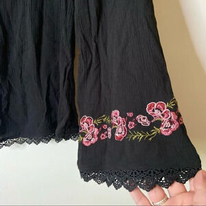 • high neckline with ruffle hem, black long sleeve blouse with pink floral embroidery and lace trim. Small pleated detail in front and keyhole back. Gauzy material, tear-drop / keyhole back opening with the button closure.