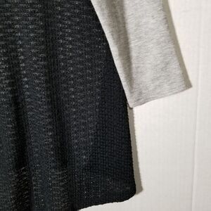 Gray and black 3/4" sleeve hi-low knit top! Soft gray knit on front with scoop neck and an open weave black back with a large keyhole feature and black ribbon tie closure leaving part of the back open!