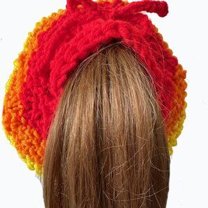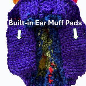 This warm and practical knit messy bun or ponytail hat features the six colors of the Gay Pride LGBT flag. It includes built-in ear muff pads to protect your ears from harsh breezes and a hair sleeve and knit tie to secure your ponytail or bun. It's handmade with 100% polyester yarn and is machine washable. Brand new.