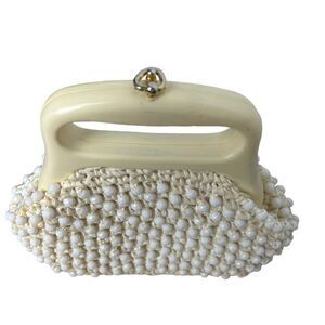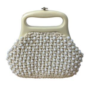 Gaymode VTG purse made in Italy celluloid handle raffia beaded 8” x 8” cream