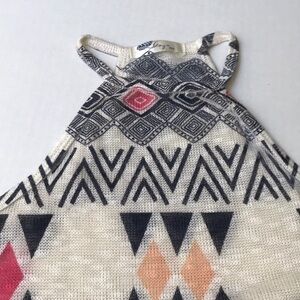 Cream, navy, red, orange and teal in color with geometric and elephant pattern