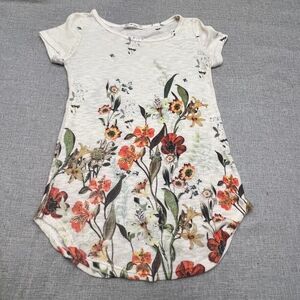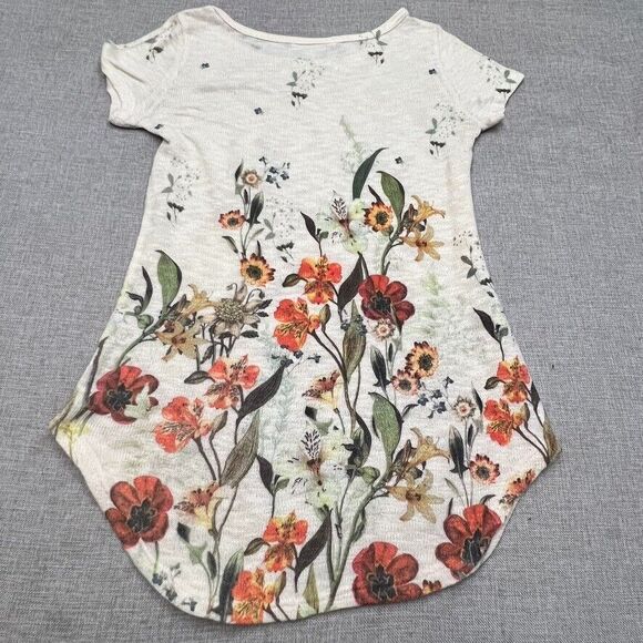Good overall condition. Fun flirty comfortable lightweight knit sweater in a boho bohemian dainty floral pattern, oval neckline, short sleeves.