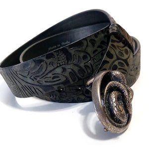 Gazzarrini Snake Buckle Green Black Embossed Leather S 50/90 Belt. Handmade embossed strap made in Italy by the manufacturer Gazzarrini, adorned with a unique buckle with a snake made in metal. this item will come with an extra strap for free.