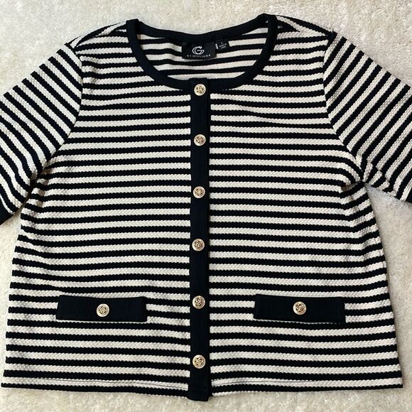 Chic and versatile G by Giuliana short sleeve cardigan-style top in black and cream stripes. Features gold-tone button-down front and decorative button pockets for a polished, sophisticated look. The textured knit fabric makes it easy to dress up for work or style casually with jeans.