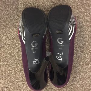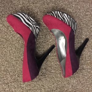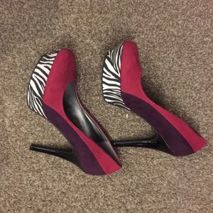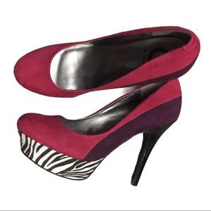 G by Guess color block platform pumps. Color block colors magenta, purple and zebra print. Small spot on the side pump (shown in the last photo) is the only barely visible flaw on these super fun shoes! Velvet suede texture, like new condition. No wear on the soles of the shoes. Women’s shoe size 9 M 5” stiletto heel 1” platform