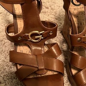 Size 10 brown strap wedges with ankle buckle.Big gold G on the top front of the shoe.