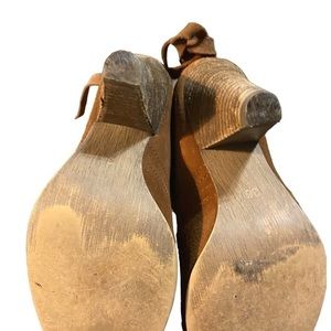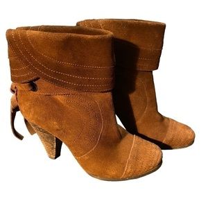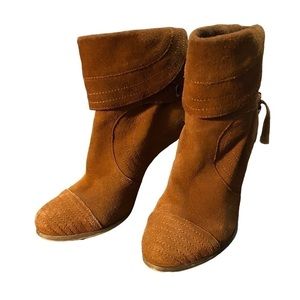 Cognac suede bootie with minor wear pictured on heel and soles. Suede tied tassel off the back.