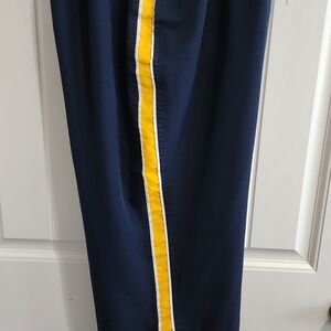 Comfortable navy blue sports pants. Features yellow stripe on sides. Ideal for athletic activities.