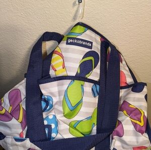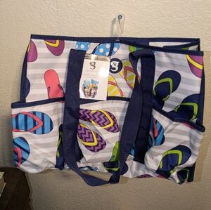 Bright utility tote with a playful flip-flop design. Features vibrant colors like blue, pink, and green. Ideal for casual outings.