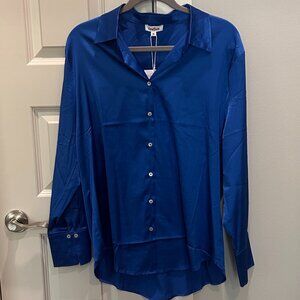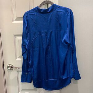 Gee Gee Royal Blue Button Down Blouse. Size M. NWT. Collar, Button on end of sleeve. Slightly longer in back.