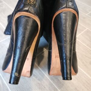 condition: has wear at the bottoms, has alot of wear on the heel, 2 very small nicks on the outter leather. the heels leather multiple noticeable tears and scratches. has light scratches throughout.