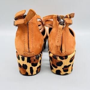 Closed round toe, soft nubuck-style leather upper, double buckle ankle straps, back zipper entry for easy on and off, flatform wedge midsole covered in faux-hair leopard print, lightly cushioned insole.