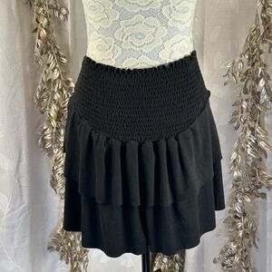 Chic black smocked waist mini skirt with layered ruffle hem. Faux suede with great stretch and flirty flow.