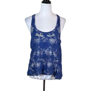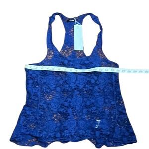 Stylish blue lace tank top with a racerback design. Perfect for casual outings.