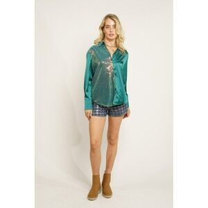 GeeGee Clothing Satin Sequin Button Up Mix Top Shirt in Emerald New S-L ST2310