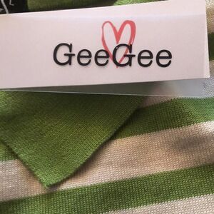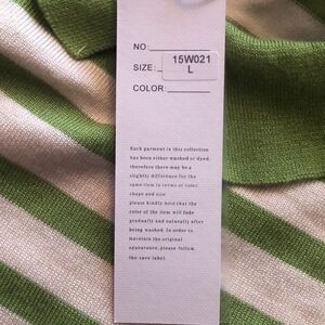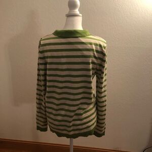 Size L green/light tan striped collared sweater. NWT, but has a tiny snag in the back
