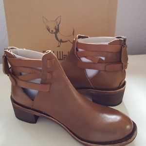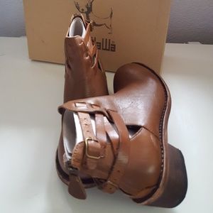 Gorgeous hand burnished leather boots from GeeWawa generally carried by Anthropologie. Although that are straps and buckles, they have a zipper back for easy of entry and exit! They aree dark burnished brown and pics are true on my camera. These have a 1.75" stacked heel and leather insole. Sole is man made. NIB Sz 8 MSRP 268