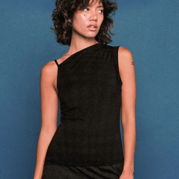 The Zoe an asymmetric draped neck, one shoulder spaghetti strap top. Featuring pleating details on the shoulder and side.