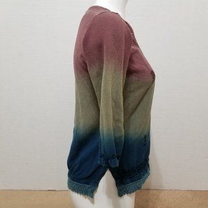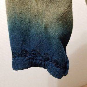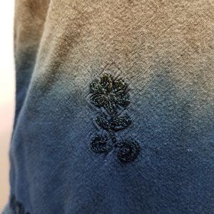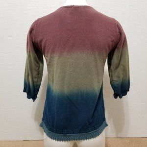 Dip dye ombre embroidered boho hippie top. Crochet knit trim. Side split. Split cuff. Vintage?