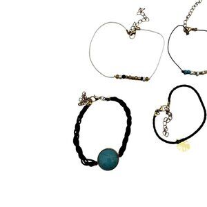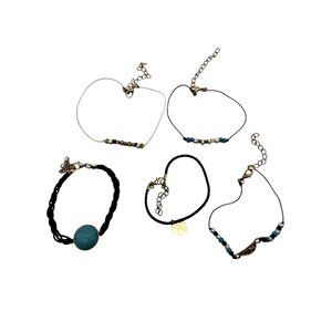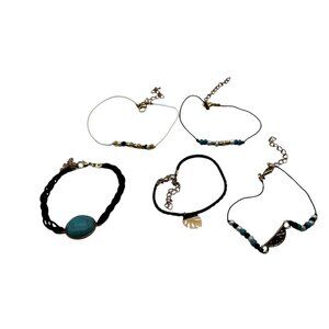 A set of five adjustable bracelets featuring elegant beadwork and gold-tone accents. Designed for versatile styling, they suit various wrist sizes.