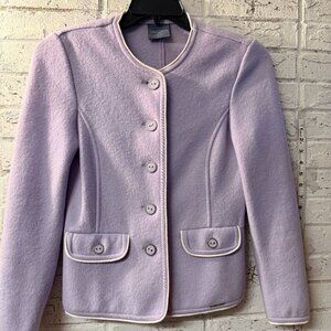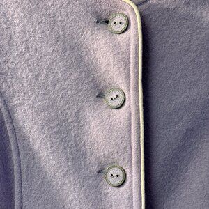 Elegant, rare, and timeless โ this authentic Geiger Pure boiled wool two-piece set is a stunning lilac dream. Made in Austria and crafted from high-quality pure new wool, this coordinated jacket and skirt pairing embodies quiet luxury and iconic European tailoring. The jacket features a classic button-front design with white contrast piping and functional front pockets, while the matching skirt showcases a charming ruffle hem for a feminine, cottagecore-inspired silhouette.