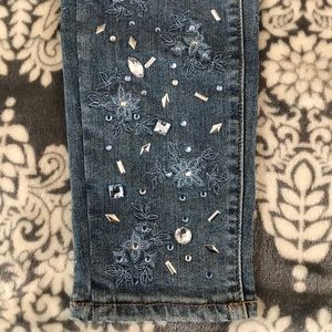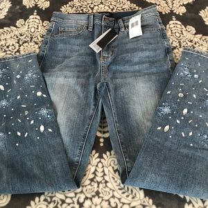 Great denim with subtle gems and stitching embellishment toward the bottom of the legs. Great touch of classy denim! High rise skinny jeans for style & comfort.