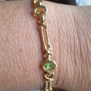 ✨This Beautiful Bracelet is studded with 5 Genuine Gemstones (Garnet, Amethyst, Peridot, Topaz & Aquamarine) in a gold tone setting with safety clasp. Pics don't show the beauty of it! An item purchased thru Lia Sophia Rep. (Cannot see a stamp). Goes with so many wardrobe options. This item would make a beautiful Gift💝.