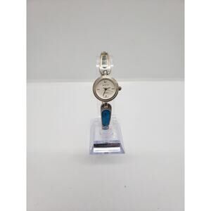 Gem Time women's dress watch. Small silver and white face with silver hands and numbers. Stainless steel back. Blue beaded bracelet band, 7.25inch. Needs battery replacement.