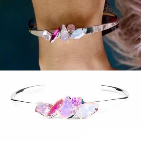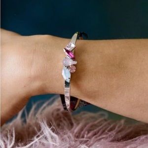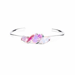 Detail ~ Varying in size and cut, an array of pink, and iridescent gems are encrusted along the top of a dainty silver cuff, creating a sparkling centerpiece.