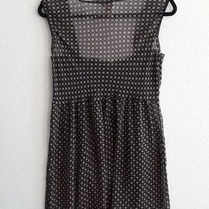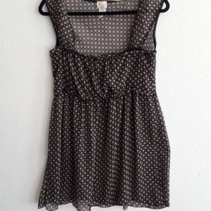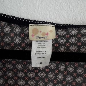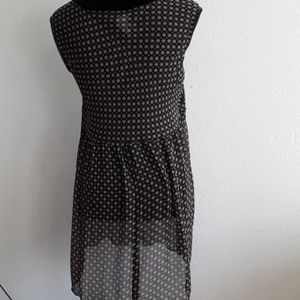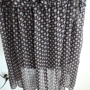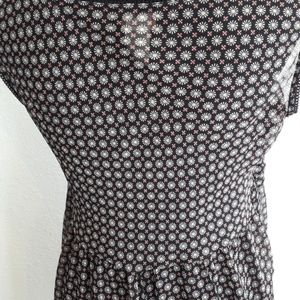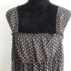 Cute airy summer top with a floral print in black, coral and peach. Scalloped edging. Gathered bodice that is lined in the front otherwise the top is sheer. Broad straps so easily can wear a bra. Elastic around bodice.