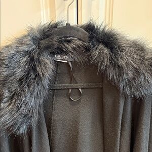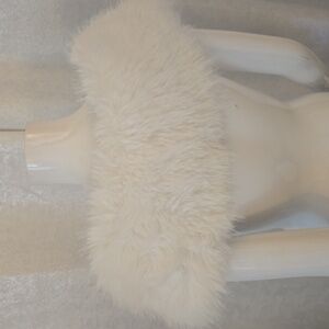 Chic white faux fur shawl with satin ribbon tie. Perfect for adding elegance to any outfit.