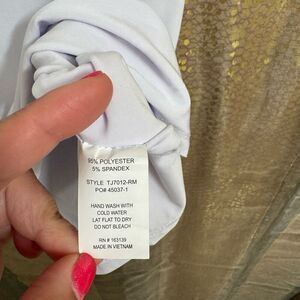Brand new with tags, never worn. Just tried it on and decided white just isn't my color. Super smooth and stretchy, NOT see through, double layered fabric. Feels really nice similar to the Express body contour line of clothes if you're familiar with that fabric. Size XL. Smoke and pet free home. Goes with anything and is a very versatile basic wardrobe staple.