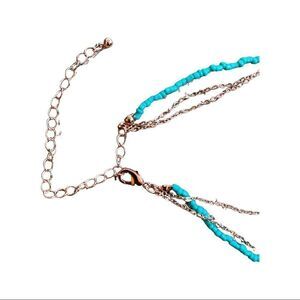 Layered aqua turquoise beaded necklace with rose gold chains and circle sun charm.