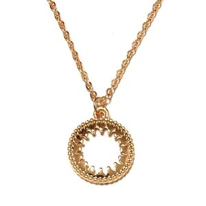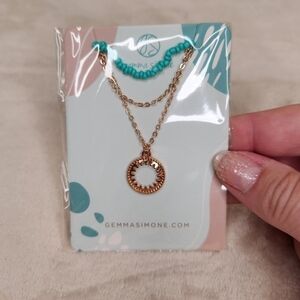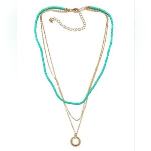 Layered aqua beaded necklace with gold chains and circle sun charm.
