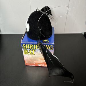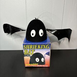 Get ready to add some spooky fun to your Halloween decor with this Gemmy 1991 Shrieking Shaking Bat W Box. This 90's Halloween prop works and hangs, but unfortunately, it does not come with any sound effects. The black color of the bat and the mixed material of the prop make it a great addition to any Halloween decor.